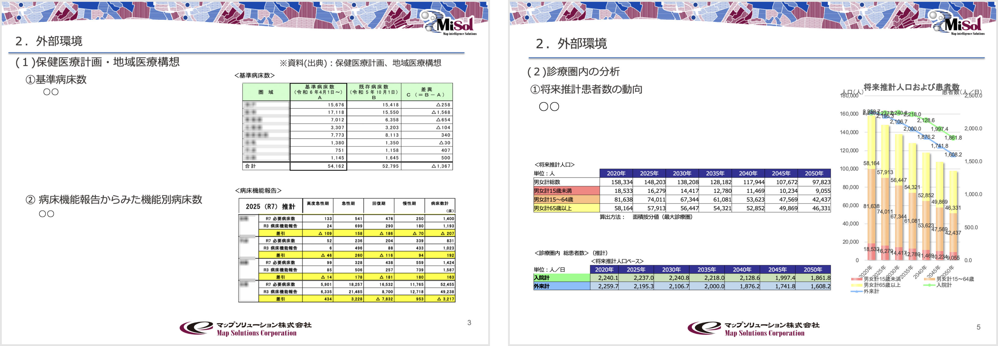 Misolを活用した公開データや保健医療計画等による医療圏分析を行い病院経営の課題を抽出します。
