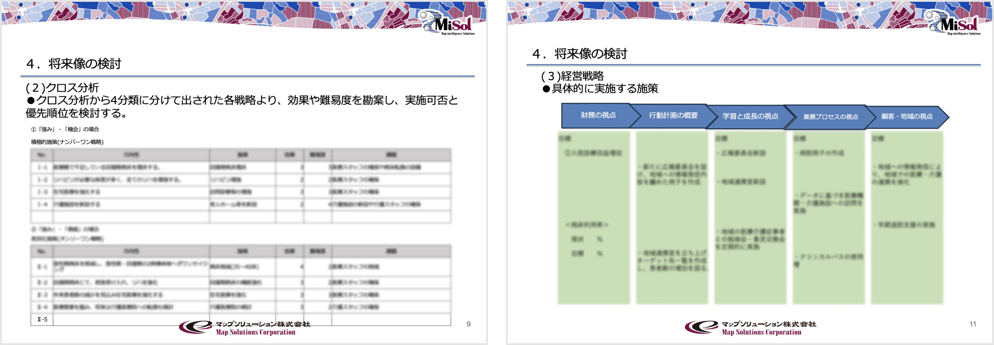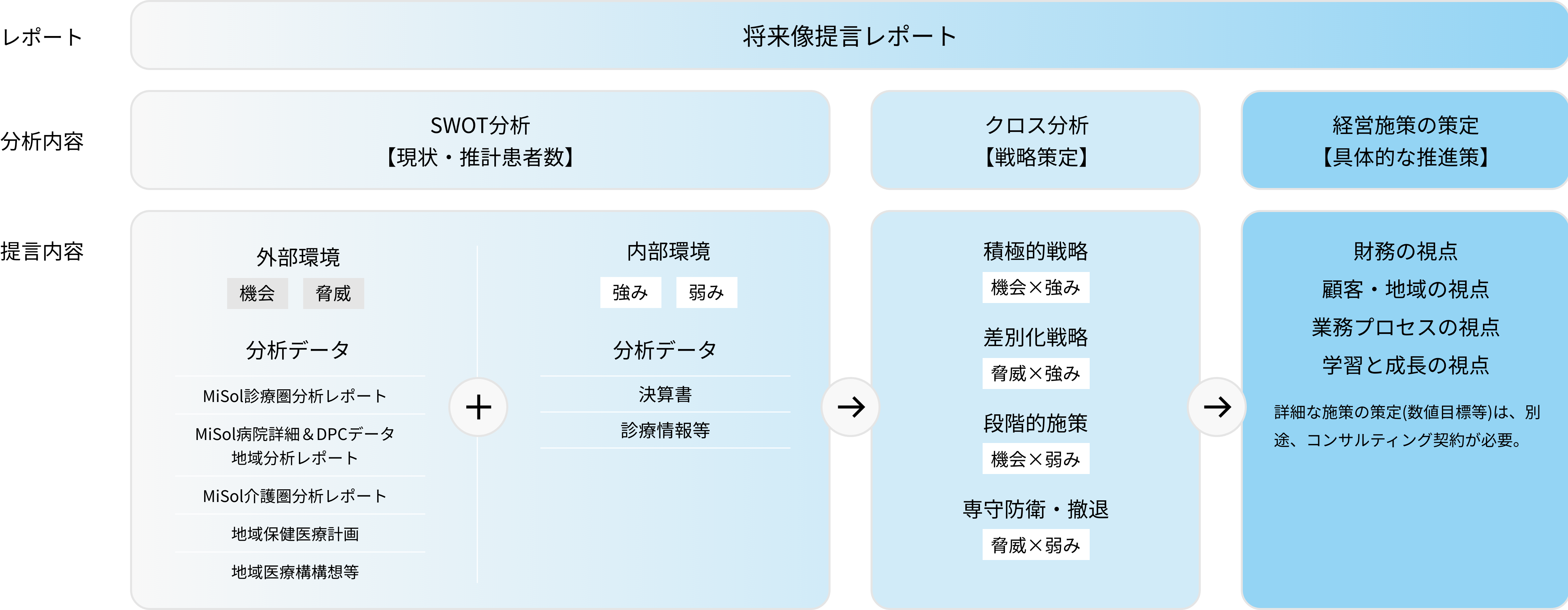 抽出した課題について「SWOT分析」及び「クロス分析」を行い、貴院の将来像提言レポートを取り纏め、報告します。